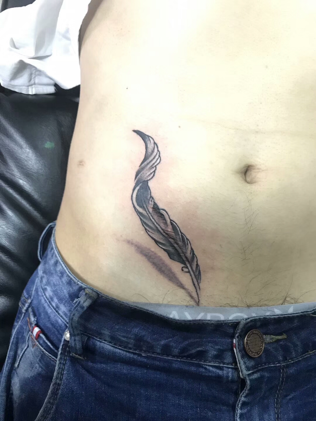 台湾顾先生慕名而来,纹在腰部的灰色羽毛纹身不得不说出自专业纹身师之手,在整个形态上似跳跃的鸟儿,似飞舞的蒲公英,羽毛的特征被设计师纹的惟妙惟肖,好像在风中飞舞一样。羽毛的底部被纹身师细心的纹上几笔阴影,好像是阳光下羽毛的倒影一样生动。